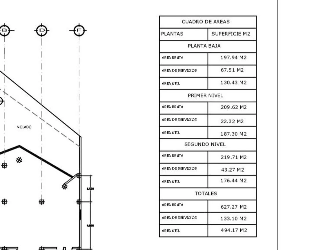 Cuenta con un área total de 627 m2 de construcción distribuidos en 494 m2 de oficinas y 133 m2 de áreas de servicio.